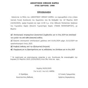 Η σύνθεση του Διοικητικού Συμβουλίου του ΑΘΛΗΤΙΚΟΥ ΟΜΙΛΟΥ ΚΑΡΕΑ, που απαρτίζεται από τα μέλη που εκλέχθηκαν από τις εκλογές της 25ης Φεβρουαρίου 2024 είναι η εξής: