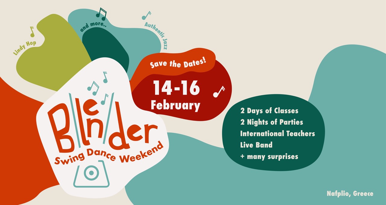 Blender Swing Dance Weekend 2025 για 3η συνεχόμενη χρονιά στον αγαπημένο μας χώρο τεχνών «Φουγάρο» στο Ναύπλιο! Από Παρασκευή 14 Φεβρουαρίου απόγευμα μέχρι Κυριακή 16 Φεβρουαρίου απόγευμα.