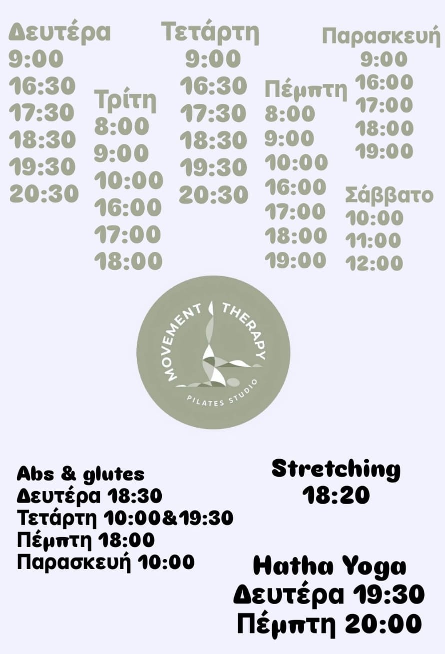 Το “Movement Therapy” προσφέρει ολοκληρωμένα προγράμματα εκγύμνασης που περιλαμβάνουν Pilates μηχανήματα, Pilates Mat, Yoga και Tabata.