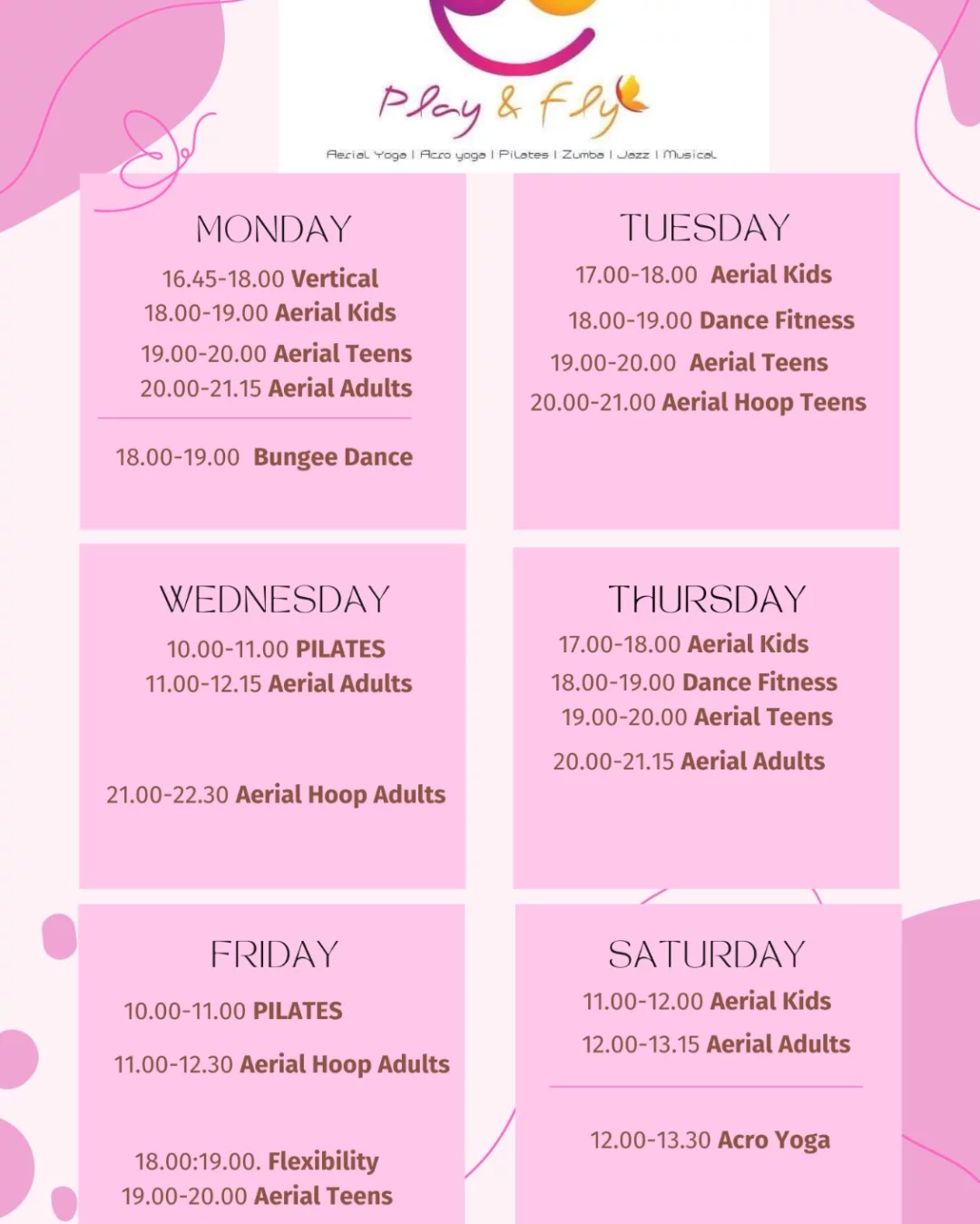 Εναέρια γυμναστική, yoga, pilates, ακροβατικά, break dance, όλα τα δρώμενα με πολλή αγάπη και ενθουσιασμό από την ιδιοκτήτρια και τους γυμναστές της! Όμορφος χώρος, καθαρός και με σωστό κλιματισμό!