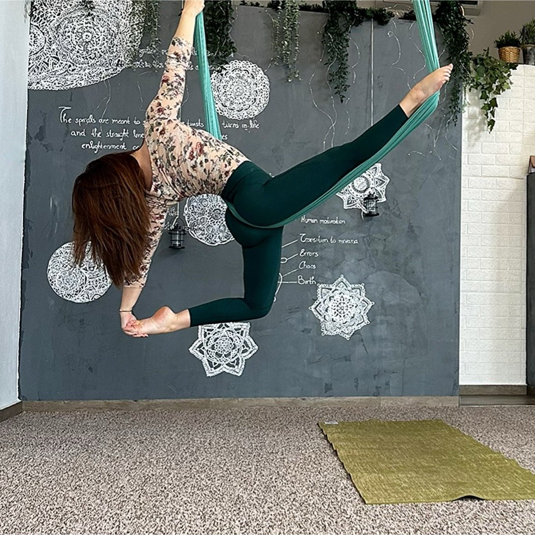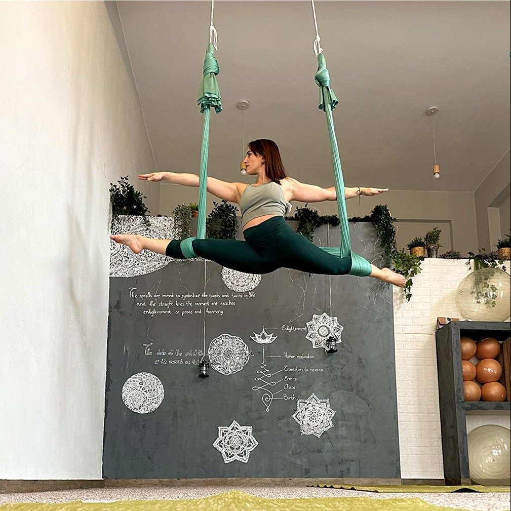 Η ακροβατική αέριαλ έχει στοιχεία από ενόργανη γυμναστική, ακροβατική και χορό. Με την χρήση του πανιού της γιόγκα ο ασκούμενος κάνει με καθοδήγηση από τον δάσκαλο ακροβατικές ασκήσεις με συγκεκριμένα δεσίματα σαν μικρές χορογραφίες. Το πανί μας επιτρέπει να εξερευνήσουμε τον χώρο σε τρεις διαστάσεις αλλά και να απελευθερωθούμε και από τον φόβο και την ένταση. Η αντίσταση στην βαρύτητα είναι συναρπαστική! Ανεβάζει την αδρεναλίνη και μας γεμίζει ενέργεια! Επιπλέον έχει αποδεδειγμένα αντικαταθλιπτική και αντί στρεσογόνο δράση!