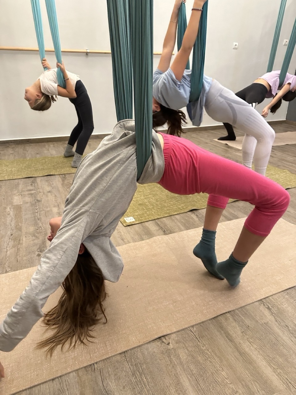 Στην aerial yoga για παιδιά χρησιμοποιούμε τις αιώρες που είναι φτιαγμένες από ειδικό ελαστικό ύφασμα καλά στερεωμένες από το ταβάνι! Τα παιδιά μαθαίνουν ακροβατικά, κάνουν ασκήσεις ενδυνάμωσης και στο τέλος του μαθήματος χαλαρώνουν και ξαπλώνουν μέσα στο πανί για χαλάρωση και διατάσεις! Ένα μάθημα που λατρεύουν όλα τα παιδιά κατάλληλο για ηλικίες από 5 ετών και πάνω.